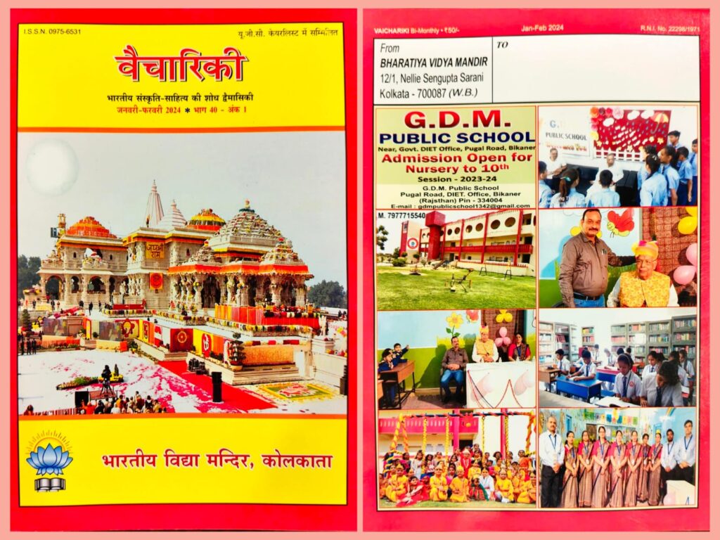 “Vaichariki” is basically a research journal published by Bharatiya Vidya Mandir. This bi-monthly magazine which publishes research articles on important subjects like religion, philosophy, science, literature, folk literature, history and archeology has been published for the last 36 years. This magazine has readers in almost all parts of the country as well as abroad. About 5000 copies of the magazine are distributed all over the country. This magazine is approved by the University Grants Commission (UGC) and it is in 20th rank. The magazine, which is committed to the promotion of Indian culture, publishes research articles of scholars from various fields.